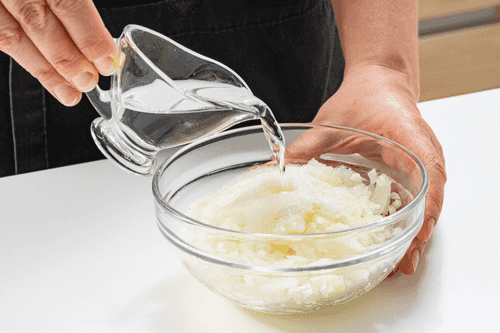 Переложить лук в небольшую миску, добавить к нему сахар и уксус, перемешать и оставить мариноваться, пока подготавливаются остальные ингредиенты.