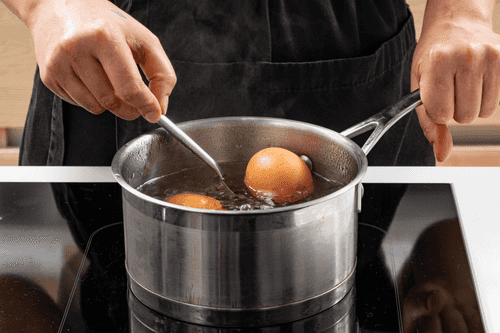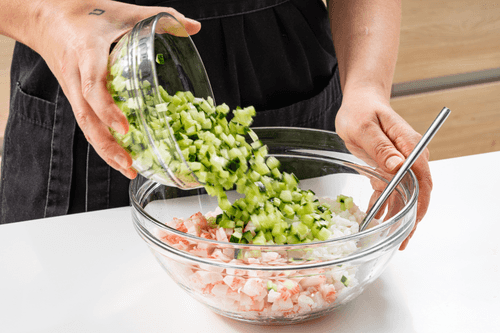 В отдельной кастрюльке вскипятить воду, положить яйца и варить их 11 минут. Затем остудить в холодной воде, чтобы остановить приготовление. Очистить и нарезать кубиками.