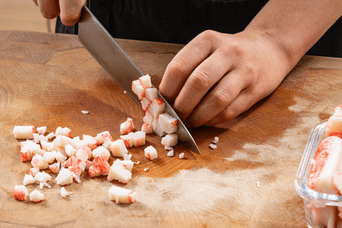 Крабовые палочки нарезать небольшими кубиками размером с кукурузные зерна.