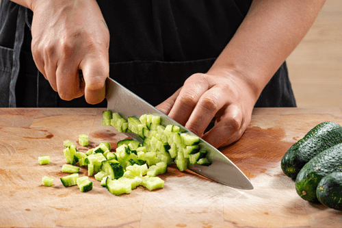 Такими же кубиками нарезать огурцы, у крупных огурцов удалить семена.