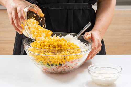 Добавить кукурузу и лук, предварительно слив из них жидкость, и заправить майонезом. Посолить и поперчить по вкусу.