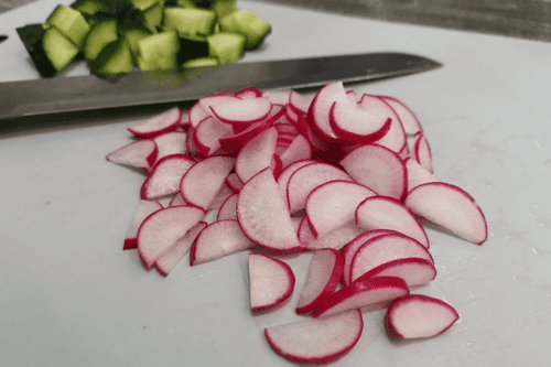 Тонко нарезать редис.