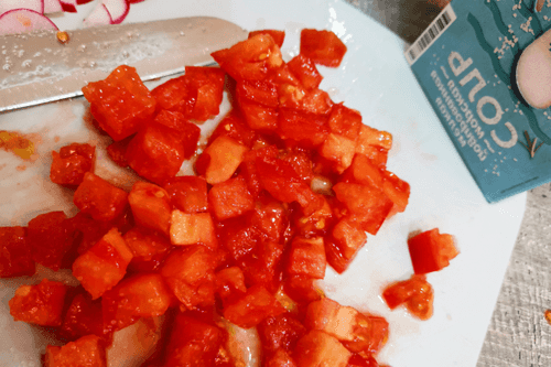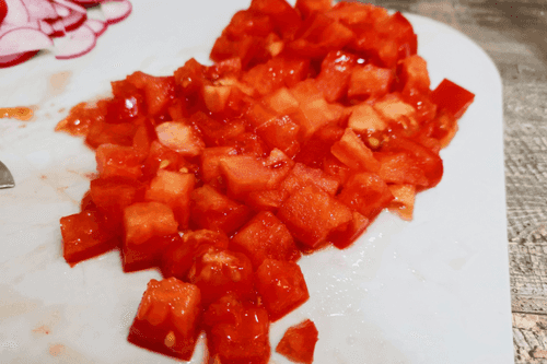 Мелко нарезать помидор.