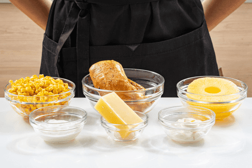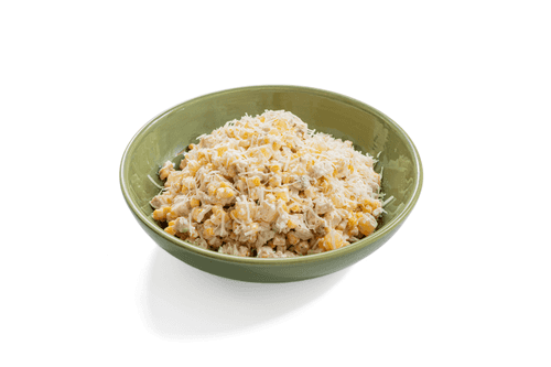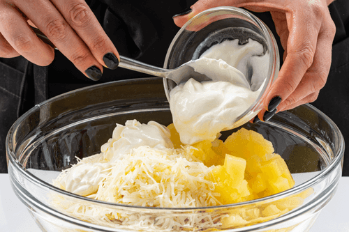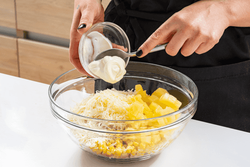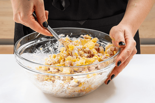 Смешать ананасы, курицу, сыр и кукурузу.