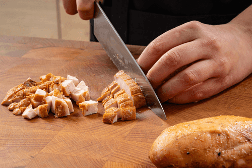 Копченую курицу нарезать небольшими кубиками.