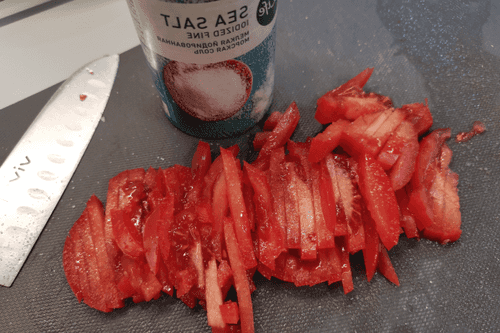 Помидор нарезать соломкой и посолить.