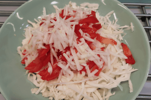 Объединить помидор и кольраби с капустой.