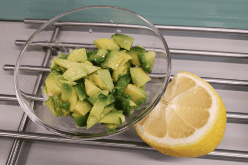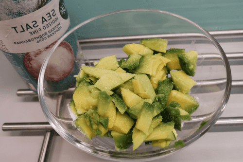 Авокадо некрупно нарезать, переложить в глубокую миску и посолить.