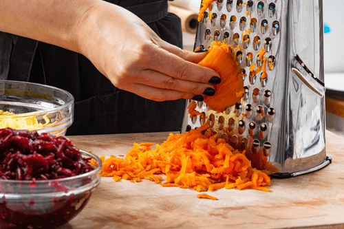 Свеклу, картофель и морковь очистить. Все овощи отдельно натереть на крупной терке.
