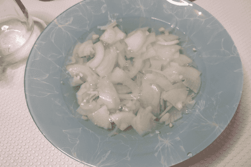 Залить лук на 5 минут кипятком, чтобы ушла горечь.