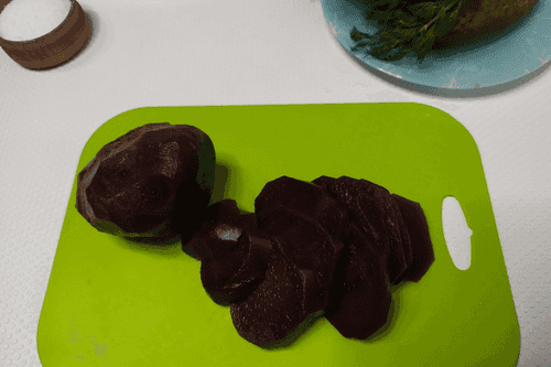 Свеклу сначала нарезать на кружочки толщиной примерно 0,5 см.