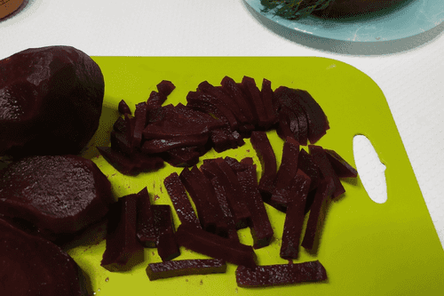 Затем каждый кружочек свеклы нарезать вдоль, чтобы получились тонкие брусочки.