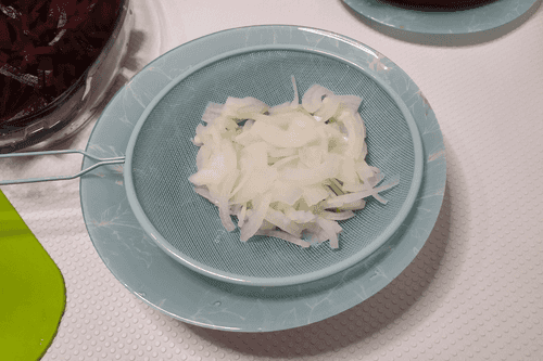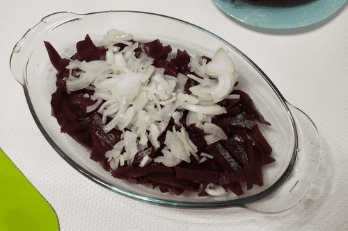 Соединить лук и нарезанную свеклу.