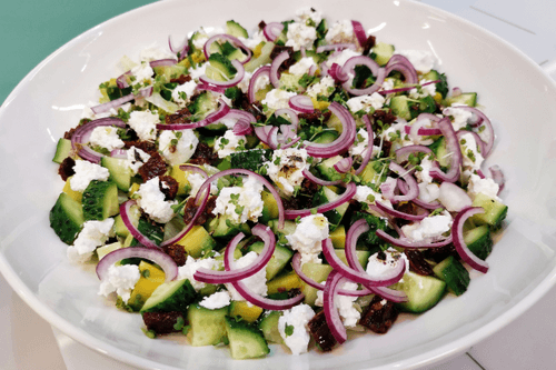 Салат с сыром фета — это классическое блюдо греческой кухни, воплощающее свежесть и гармонию вкусов Средиземноморья. Его история восходит к традициям древней Эллады, где сочетание свежих овощей, сыра и ароматных специй было не только питательным, но и символом простоты и изысканности. Нежный айсберг придаёт салату хрустящую текстуру, авокадо — сливочную мягкость, а вяленые помидоры и огурцы — богатство вкусовых оттенков. Фета, со своей пикантной солоноватостью, прекрасно дополняет композицию, а пряная заправка с лимонным соком и прованскими травами придаёт блюду выразительный аромат. Этот салат идеально подходит как лёгкая закуска или дополнение к основным блюдам, даря ощущение свежести и лёгкости. Изысканный, но в то же время простой, он становится ярким акцентом любого стола.