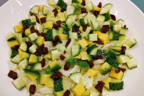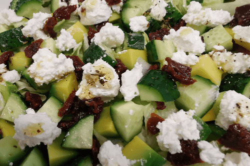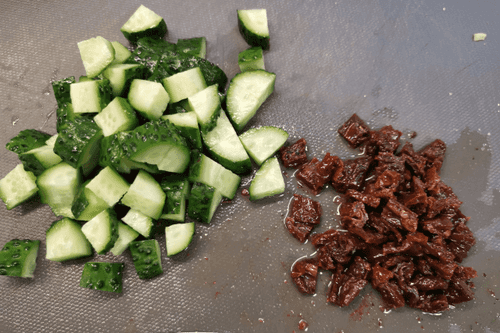Огурцы нарезать кубиками. Мелко нарезать вяленые помидоры.