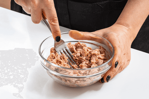 Слить жидкость из банки с тунцом. Размять тунец вилкой.