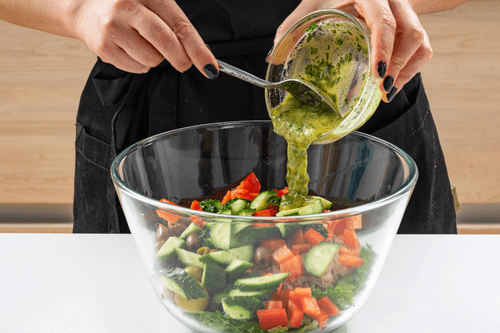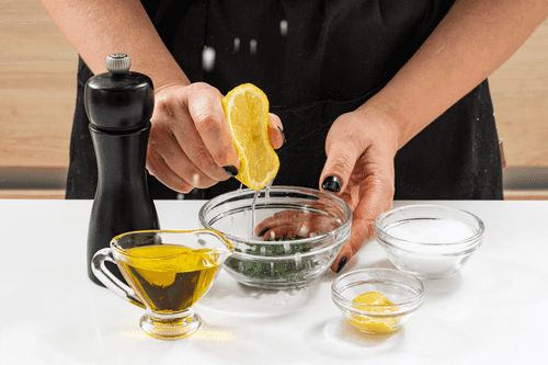 Приготовить заправку. Смешать петрушку с лимонным соком, горчицей и оливковым маслом. Посолить и поперчить.