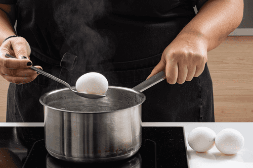 Яйца опустить в кипящую воду и варить 13 минут, затем охладить под проточной водой.