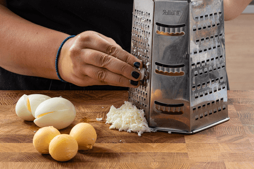 Отделить белки от желтков, белки натереть на мелкой терке.
