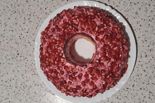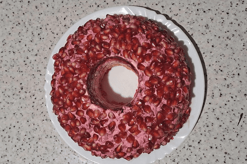 Гранат очистить от кожуры. Семена граната выложить верхним слоем. Аккуратно извлечь стакан.
