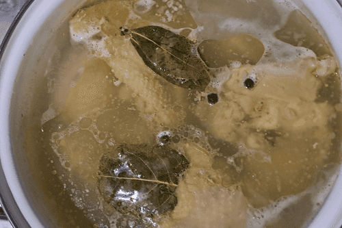 Куриные бедра хорошо вымыть, залить холодной водой, посолить по вкусу, выложить в кастрюлю лавровый лист и душистый перец горошком, поставить на огонь и варить до готовности примерно 40 минут. Остудить.