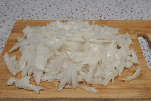 Лук очистить, хорошо вымыть, немного просушить и нарезать соломкой.