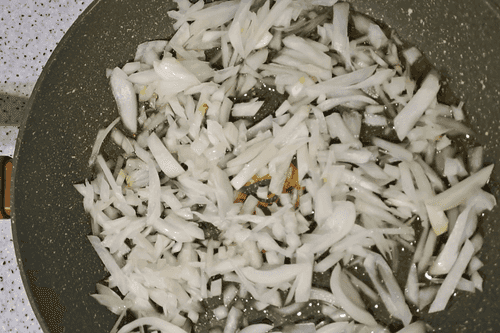 В сковороду влить 25 мл растительного масла, выложить в сковороду лук.