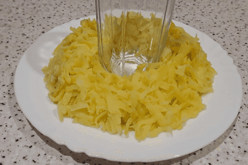 Остывший вареный картофель очистить от кожуры, натереть на крупной терке. Выложить картофель на тарелку вокруг стакана. Посолить по вкусу, смазать майонезом.