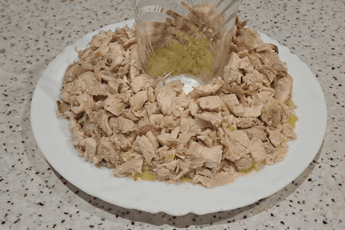 Остывшие куриные бедра отделить от кости, убрать кожицу и все лишнее, нарезать кубиками, выложить следующим слоем на картофель. Смазать майонезом.