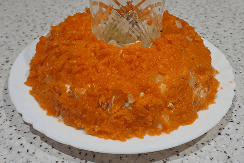 Следующим слоем выложить морковь, смазать майонезом. По желанию после моркови можно выложить грецкие орехи, предварительно мелко измельченные.