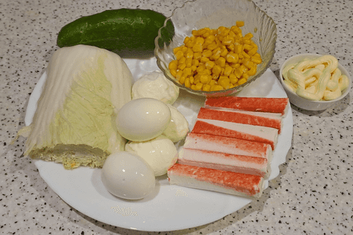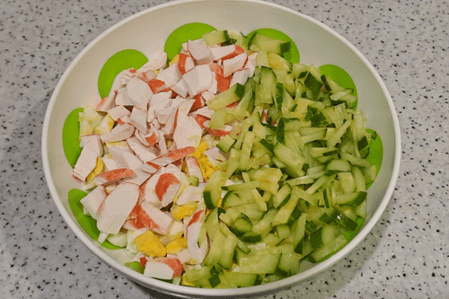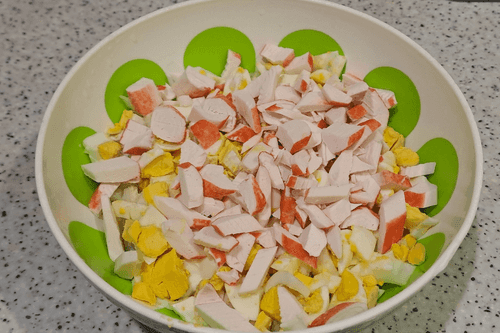 Выложить нарезанные яйца в емкость к кукурузе и капусте.