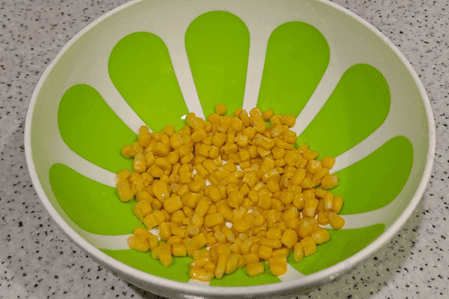 Консервированную кукурузу открыть, слить жидкость и выложить в емкость.