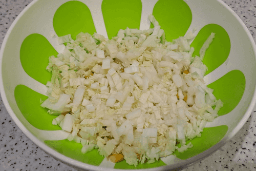 Пекинскую капусту хорошо вымыть, немного просушить, мелко нарезать и выложить к кукурузе.