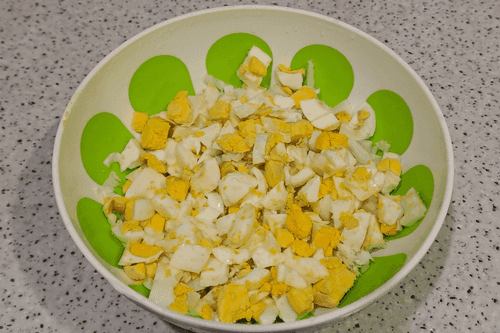Яйца варить 10 минут. В воду предварительно добавить щепотку соли. Отваренные яйца залить холодной водой. Остывшие яйца очистить и нарезать соломкой или кубиками среднего размера.