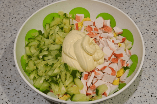 Крабовые палочки очистить от упаковки, нарезать кубиками или соломкой среднего размера.