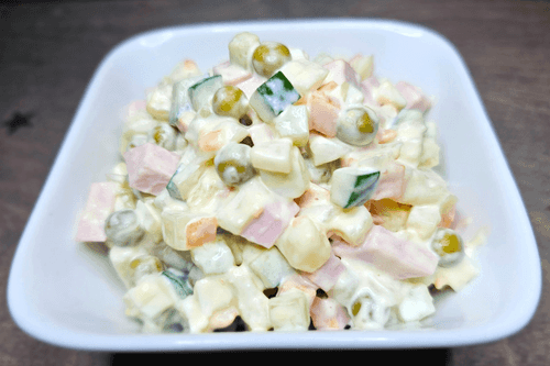 Оливье — легендарный салат русской кухни, символ праздничного застолья и домашнего уюта. Его история начинается в XIX веке, когда французский шеф-повар Люсьен Оливье готовил в Москве изысканный вариант этого блюда. Сегодня салат — это сочетание нежных варёных овощей, пикантности маринованных огурцов, мягкости докторской колбасы и свежести зелёного горошка. Заправленный майонезом, он приобретает насыщенный, гармоничный вкус, где солоноватость, сладость и лёгкая кислинка идеально сбалансированы. Оливье широко используется как универсальное праздничное угощение и является неотъемлемой частью новогоднего меню в России. Его кремовая консистенция и насыщенный вкус делают его любимым блюдом, которое собирает за столом семьи и друзей, создавая атмосферу тепла и радости.