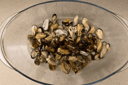 Выложить мидии в форму для запекания и добавить соус с розмарином.