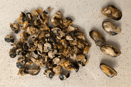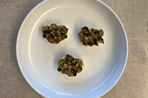 Сыр выложить на форму для подачи, сверху выложить слой из мяса мидий.