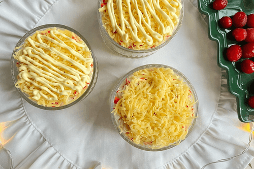 Для следующего слоя сыр натереть на мелкой терке, выложить на крабовые палочки и сделать сеточку из майонеза. Для последнего слоя желтки натереть на мелкой терке или размять вилкой. Посыпать ими сырный слой. Украсить салат по вкусу.