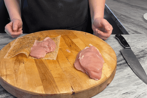 Разрезать куриное филе на две части. Взять листы для жарки курицы и завернуть в них филе. Разогреть сковороду. Обжарить куриное филе на среднем огне до золотистой корочки и полной готовности. Дать мясу остыть.