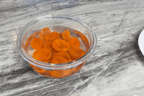 Замочить курагу в горячей воде на 10–15 минут, чтобы она стала мягкой. Слить воду и обсушить сухофрукты. Нарезать курагу мелкими кусочками.