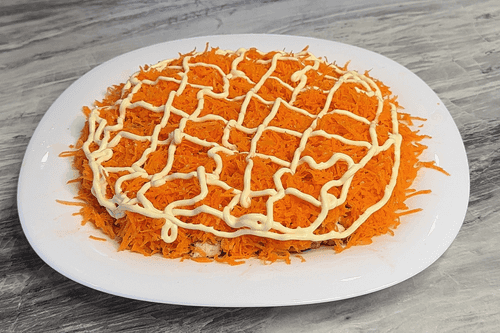 Уложить натертую морковь, сеточку из майонеза, потом курагу. После снова сеточку из майонеза.