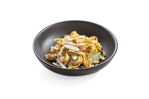 Салат с яичными блинчиками — оригинальное блюдо русской кухни, сочетающее мягкость яичных блинов, нежность ветчины и свежесть огурцов. Его история связана с домашней кухней, где хозяйки экспериментировали с простыми ингредиентами, создавая необычные комбинации. Тонкие яичные блины, нарезанные лапшой, придают салату легкость, а заправка из майонеза, сметаны и соевого соуса добавляет пикантную нотку. Хрустящий жареный арахис завершает вкусовую композицию, добавляя контраст текстур. Салат идеален как самостоятельное блюдо или как дополнение к мясным и овощным гарнирам. Он отлично подходит для праздничных застолий и уютных семейных ужинов, радуя своей необычной подачей и насыщенным вкусом.
