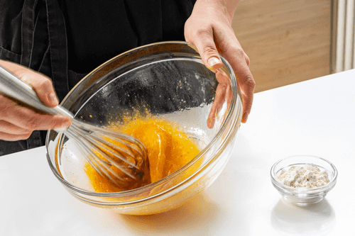 Яйца взбить с солью и карри до состояния пены. Добавить муку и снова взбить.