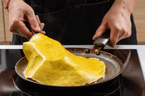 Разогреть сковороду с растительным маслом, вылить на нее немного яичной смеси и пожарить тонкий блинчик. Таким образом пожарить все блинчики.