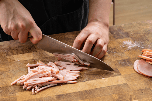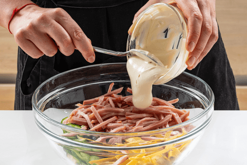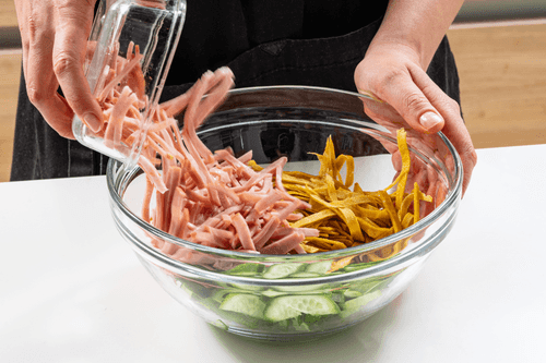 Нарезать ветчину соломкой.