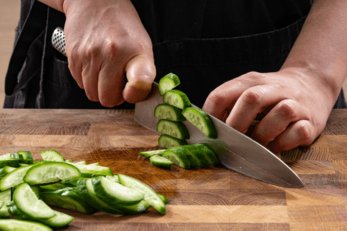 Огурцы нарезать вытянутыми полукольцами.
