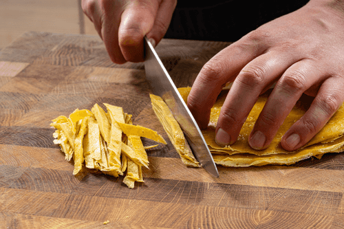Остывшие блины нарезать лапшой.