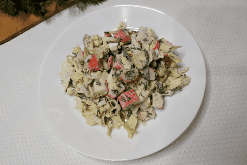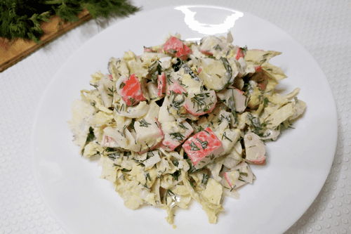 Легкий салат из пекинской капусты и крабовых палочек — это нежное и освежающее блюдо, которое идеально подойдет как закуска или легкий ужин. Его основа — сочная пекинская капуста, придающая хрусткость, а крабовые палочки добавляют сладковатый морской оттенок. Освежающие огурцы и ароматный укроп делают вкус еще более гармоничным, а пикантный соус на основе греческого йогурта с горчицей и лимонным соком придает блюду утонченную кислинку. Это блюдо часто встречается в европейской кухне благодаря своей простоте и сбалансированному вкусу. Оно идеально сочетается с хрустящими тостами или нежным багетом и прекрасно подходит для праздничного или повседневного стола.