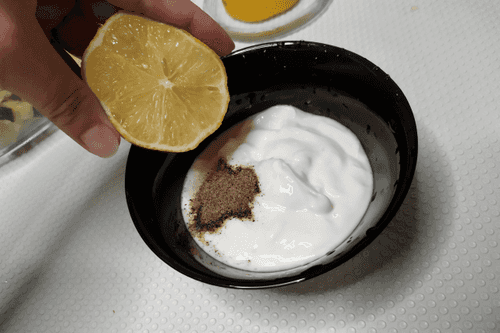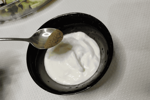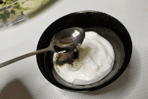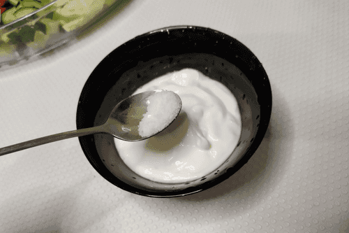 Приготовить соус для салата. Сначала добавить в греческий йогурт 0,5 чайной ложки соли.